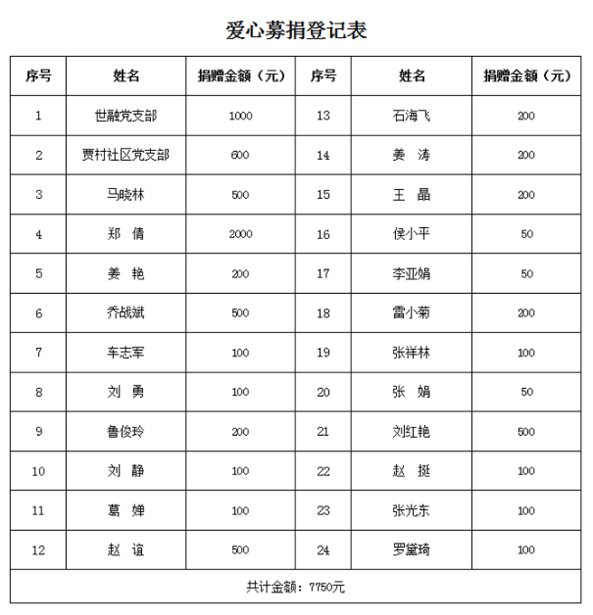 副董事长何彦奎随物业公司捐款10000元,全体党员和员工纷纷伸出援助之手,慷慨解囊,踊跃捐款,传递着爱的温暖。10000、2000、500、100......大家以实际行动表达自己的爱心与关怀,在短短的3天时间,共筹得爱心款7750元。